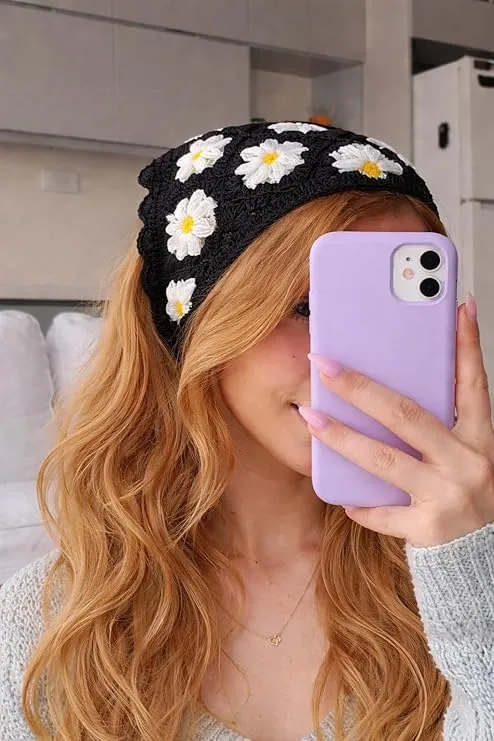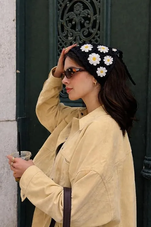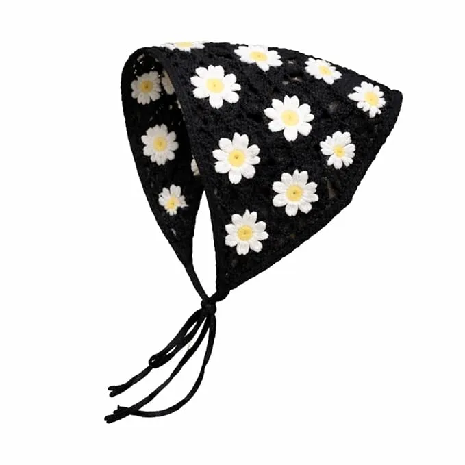 Black Handmade Crochet Daisy Bandana – Floral Knit Head Scarf | Boho Hair Accessory for WomenBlack Handmade Crochet Daisy Bandana – Floral Knit Head Scarf | Boho Hair Accessory for Women