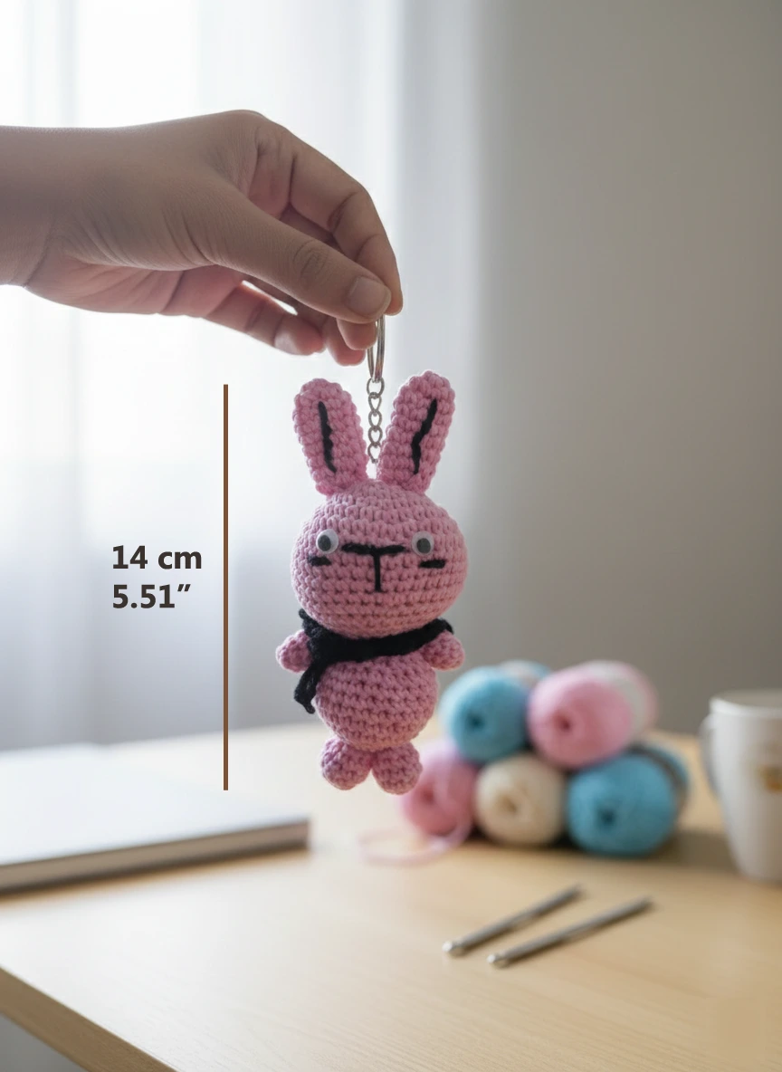 Add a touch of cuteness to your essentials with this handmade crochet pink bunny keychain. Carefully crafted using soft, high-quality wool, this adorable amigurumi bunny features long ears, tiny details, and a charming look that makes it perfect for all ages.