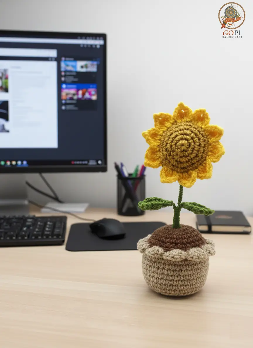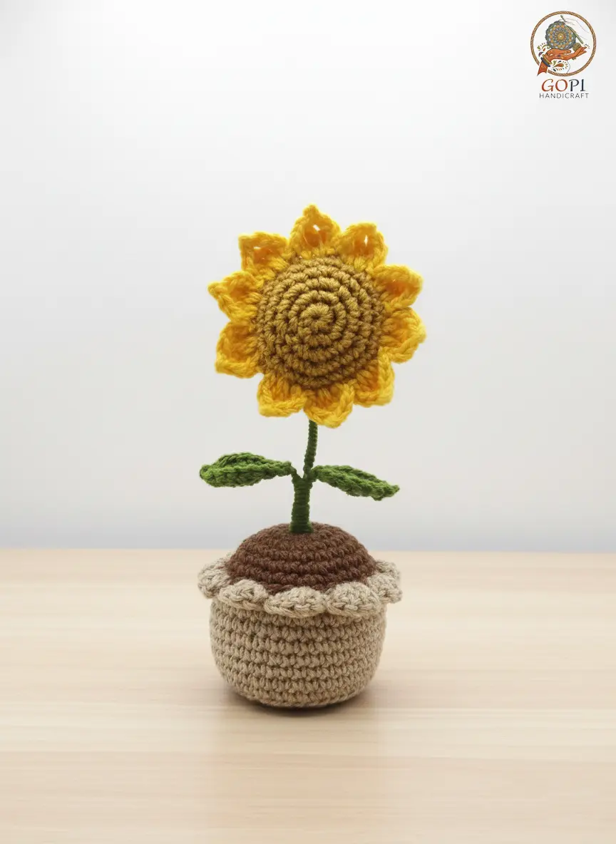Handmade Crochet Sunflower Flower Pot | Decorative Desk Plant | Home & Office Decor