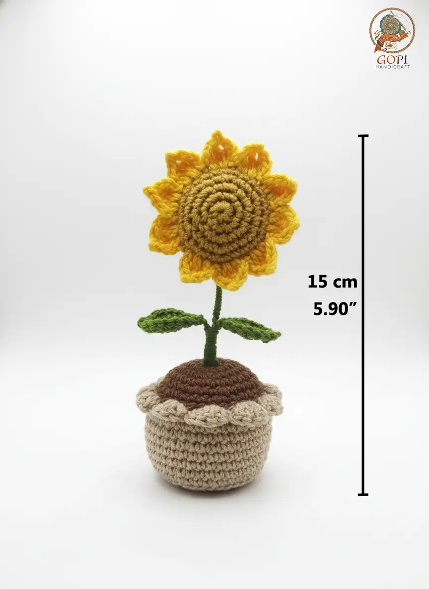 Bring everlasting sunshine to your space with this handmade crochet sunflower flower pot, beautifully crafted using premium quality . This charming knitted sunflower sits in a soft crochet pot, making it a perfect eco-friendly, maintenance-free décor piece for homes, offices, desks, shelves, or gifting.