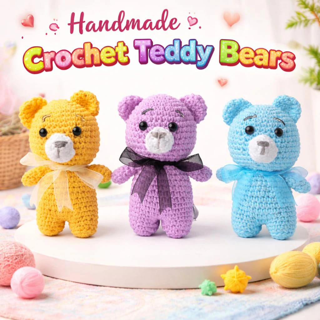 Add charm and cuteness to your collection with these handmade crochet teddy bears, crafted with love using premium soft wool. These adorable amigurumi plush toys come in vibrant color like yellow, pink, and blue, each decorated with a stylish ribbon bow, making them perfect for kids, gifting, or home décor.
