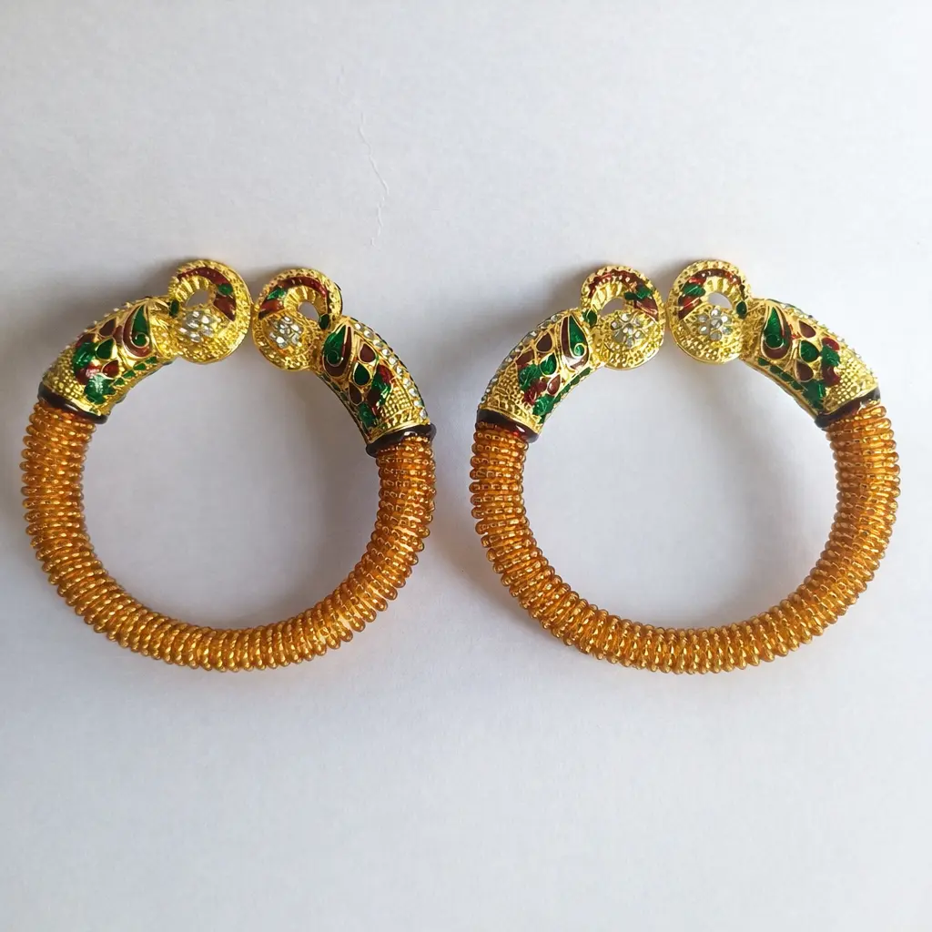 Enhance your traditional look with these stunning Peacock Design Gold Plated Kada Bangles for Women. Designed with fine craftsmanship, these bangles feature a unique peacock motif adorned with sparkling stones and vibrant enamel work in red and green tones. The textured gold finish adds a luxurious and timeless appeal.