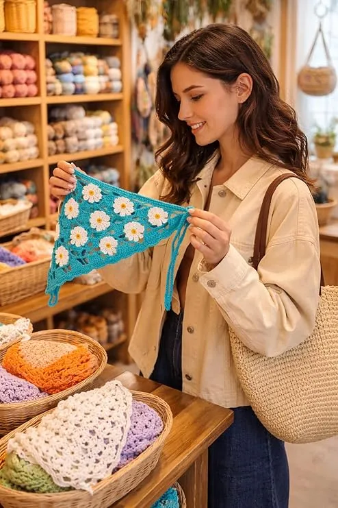 Add a touch of elegance and handmade charm to your style with our Handmade Crochet Floral Triangle Scarf, beautifully crafted with a delicate daisy pattern design. This lightweight and breathable crochet bandana is perfect for everyday wear, giving you a trendy boho look while staying comfortable.